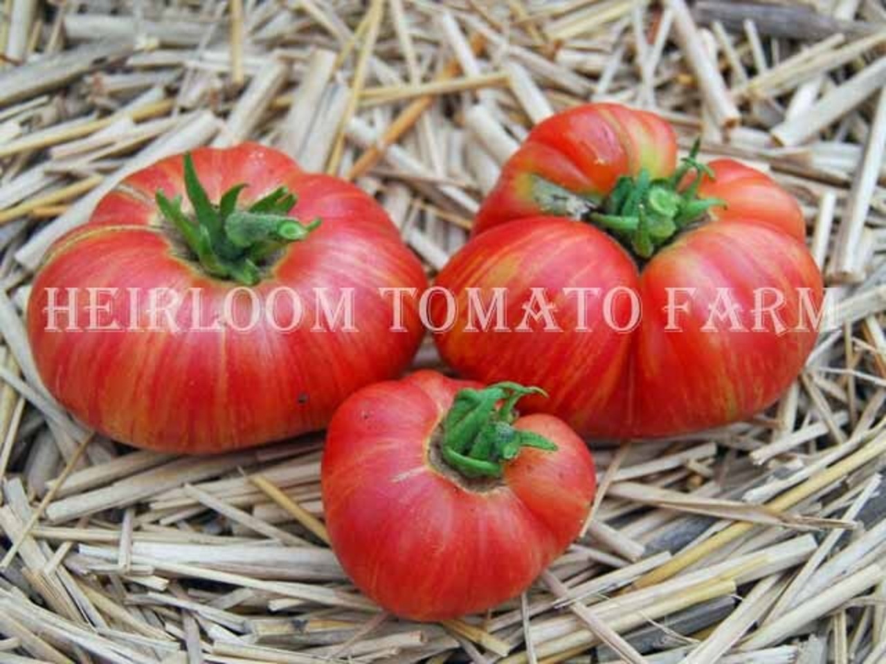 ◆元々は2011年にVince Lavalloによって "Dwarf Wild Fred " と"Beauty King"の交配から作出され、『Dwarf Tomato Project ドワーフ(矮性品種)・トマト・プロジェクト』によってさらに選抜を重ねて2013年にリリースされた。重さ約50gから約350g、幾分フラット(扁平)でクリムソン・ピンクにオレンジスプラッシュが入るバイカラー(複色)品種。