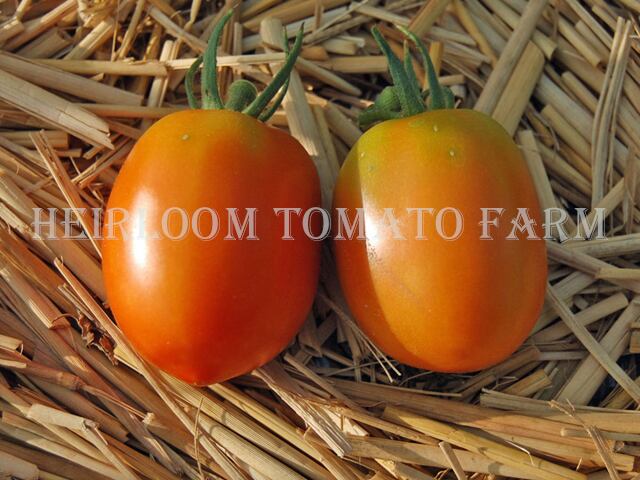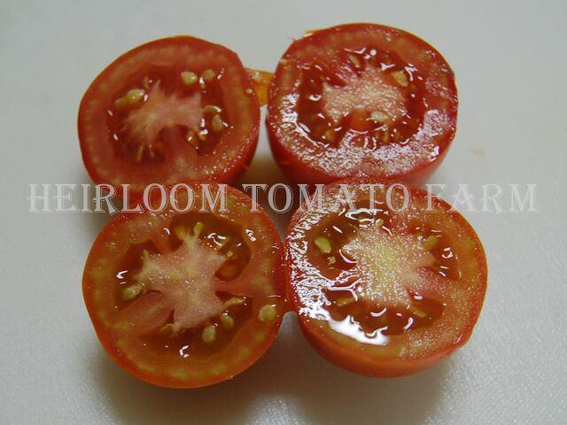 ◆直径約5.5〜6cm、約120〜250gで幾分平たいダーク・レッドにブラウンの斑が入る。ポテトリーフ品種でプラム形のスイート・ジューシーな果実を1房に2〜3果着ける。サラダ向きなロシア生まれのエアルーム品種。