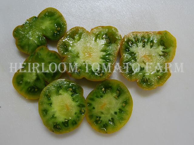 ◆出自は定かでは無いが、"German Greenwich"からの選抜と言われる。幾分平たいグリーンにイエロー・ブラウンの斑が入る、約120〜280gのビーフステーキ状果肉品種。種子はわずかしか収穫出来ない。種子が少なく食べやすい。グッド・フレイバー。