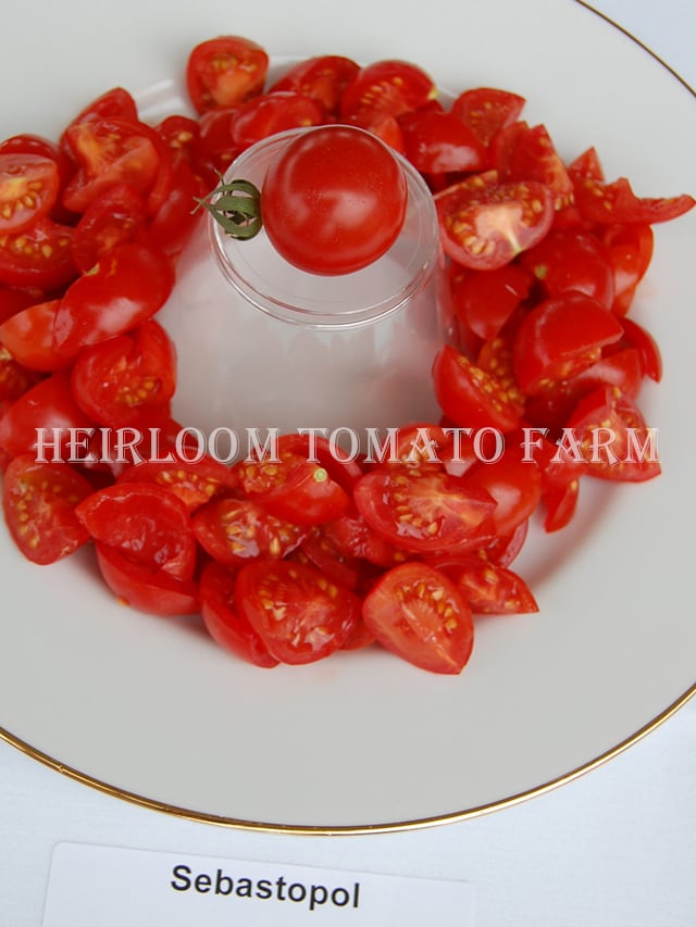 ◆70年にわたってこれを育ててきたカリフォルニアのセバストポルの老婦人からがオリジナル。レギュラー・リーフで直径約1.8cmのレッド・チェリー・トマト。1房に8〜10果着ける。スイート・テイストでタルトなフレイバー。栽培期間が短い地域、海岸地域、夏に霧が発生するような場所や冷涼な地域に向く。サラダやおやつに向く。