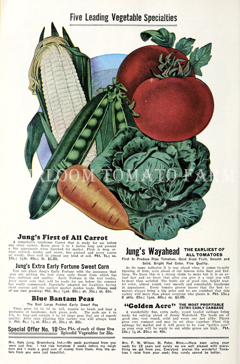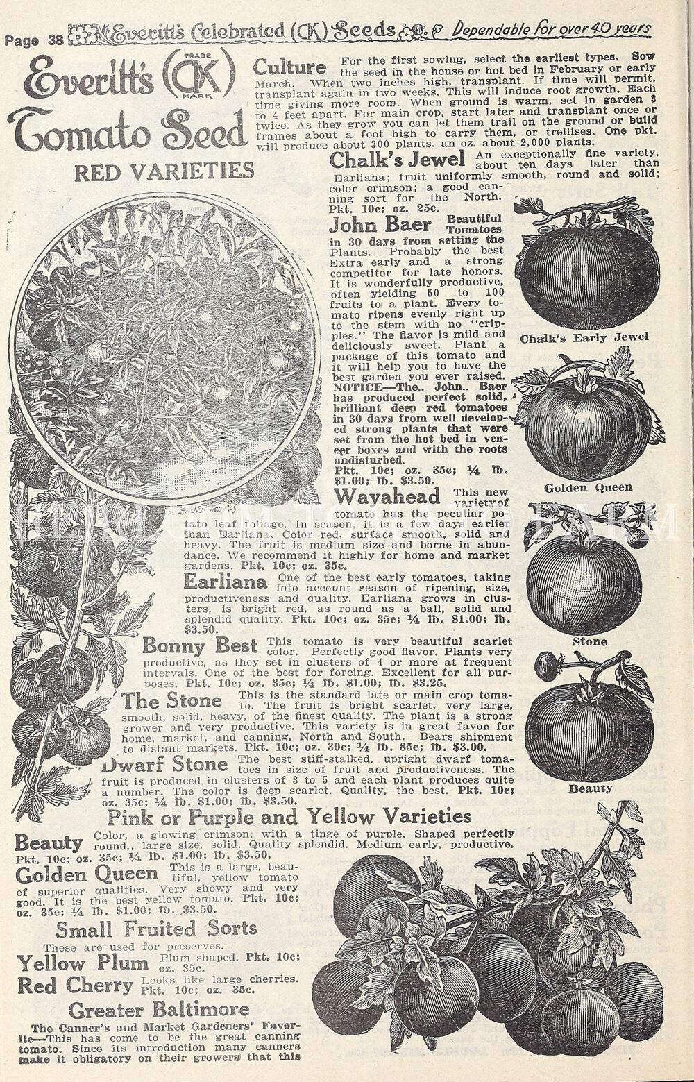 ”As its name indicates, it's "wayahead" when it comes to early ripening. First offered in our 1921 catalog, Wayahead remains one of our most popular heirloom tomatoes. For many years we placed ads in magazines and newspapers offering a package of Wayahead for 10 cents. You might say the Wayahead tomato helped build our business as many loyal customers resulted from the 10 cent purchase. The tomatoes are medium sized, nearly round, bright red and very smooth. The flesh is solid with true tomato flavor. One of the finest for juice. Determinate.”