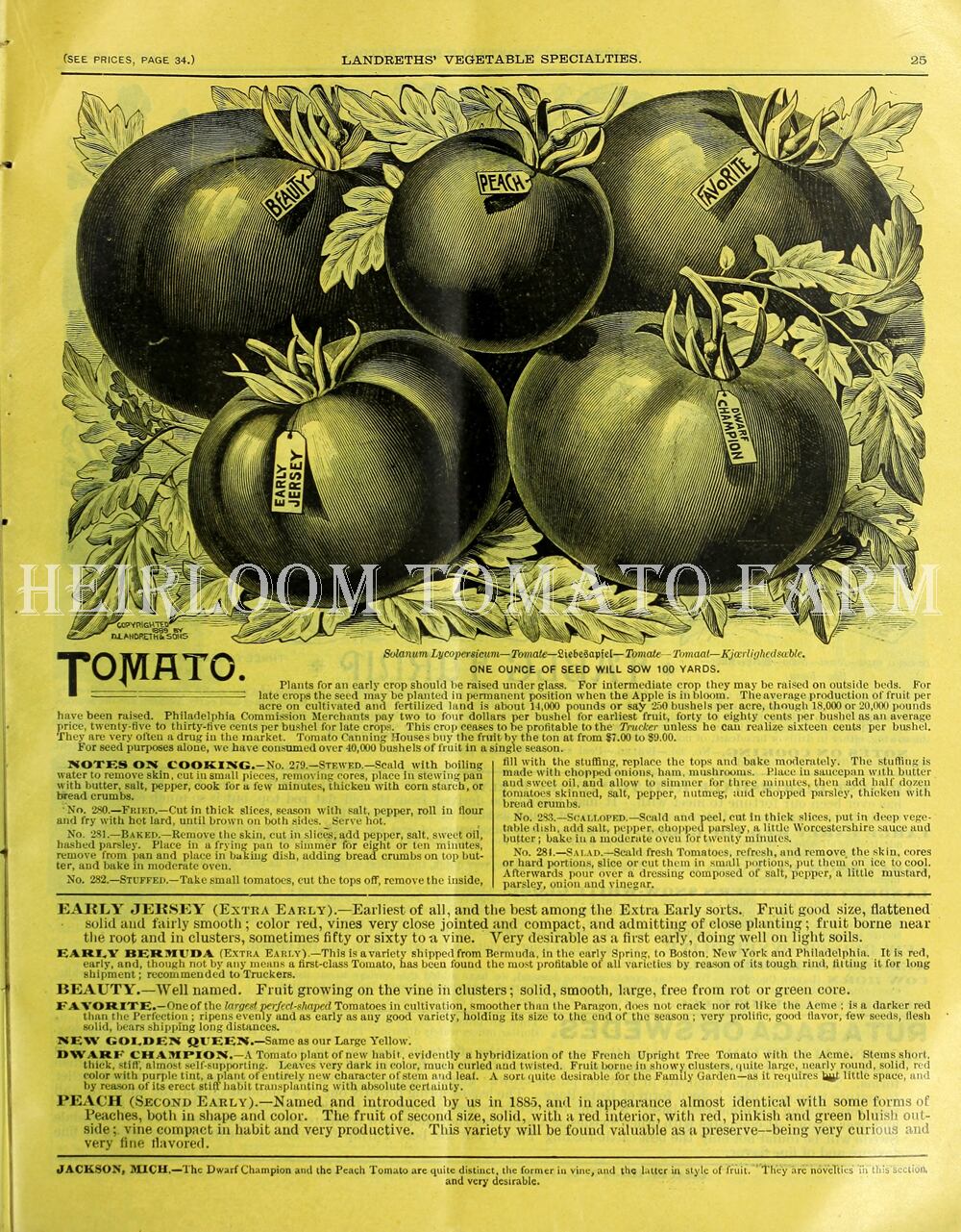 ◆1890年にフィラデルフィアのWm Henry Maule'sのカタログに掲載された、フランス生まれの幾分平たいラウンド形の約90g〜240gで熟すとパープル・レッドになる。酸味と甘さの程よいバランスでデリシャス。ダーク・グリーンのフォリエイジ。栽培期間が短い。冷涼な地域に向く。