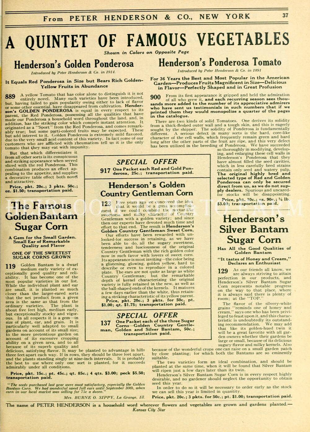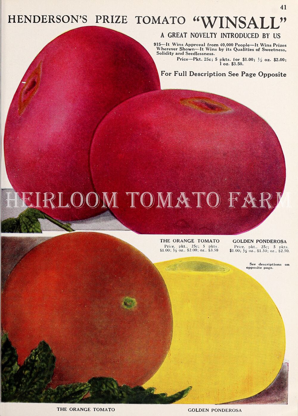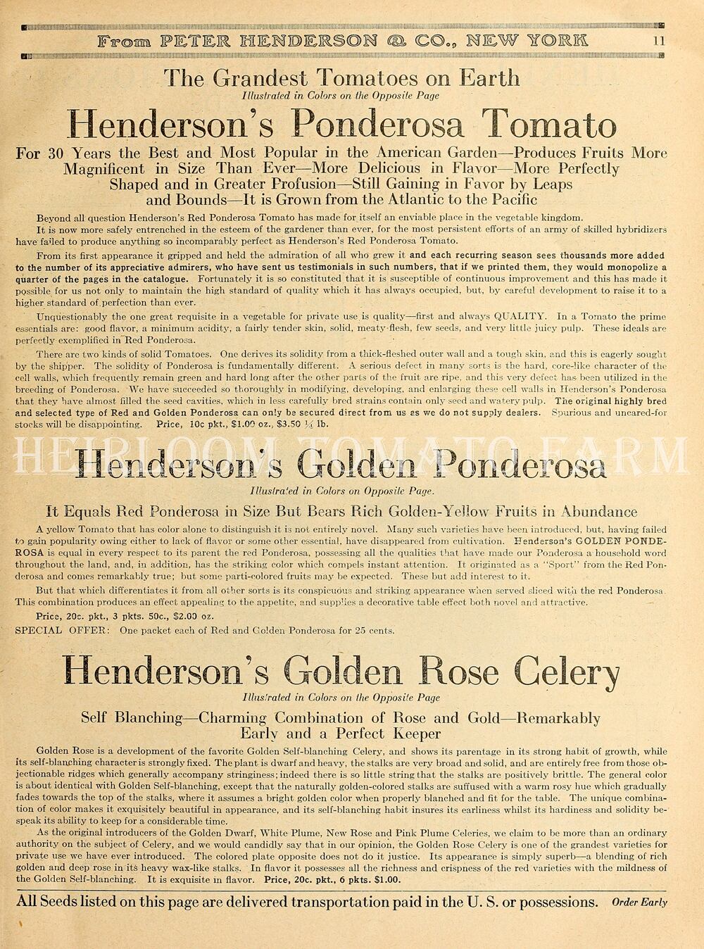 A yellow Tomato that has color alone to distinguish it is not entirely novel. Many such varieties have been introduced, but have failed. COLDEN PONDEROSA is equal in every respect to its parent the red Ponderosa, possessing all the qualities that have made our Ponderosa a household word throughout the land, and. in addition, has the striking color which compels instant attention. It originated as a "Sport" from red Ponderosa and comes remarkably true; but some parti-colored fruits may be expected. For salad purposes it presents an attractive and inviting appearance. Season 85 days.