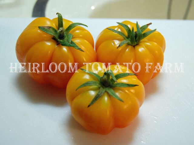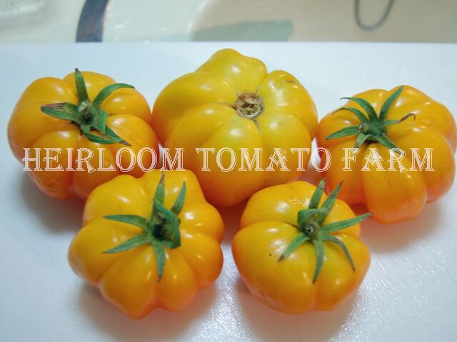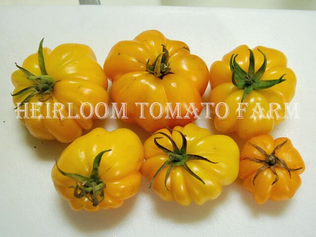 ◆非常に綺麗なアコーデイオンにようなプリーツを持つブライト・イエロー・トマト。1房に3〜6果着ける。中身を取り除くと、サラダやデザート、詰め物のために美しい容器を提供します。エクセレント・フレイバーなクラシック・エアルーム品種。種子はほとんど摂れず貴重だが、食べやすいとも言える。